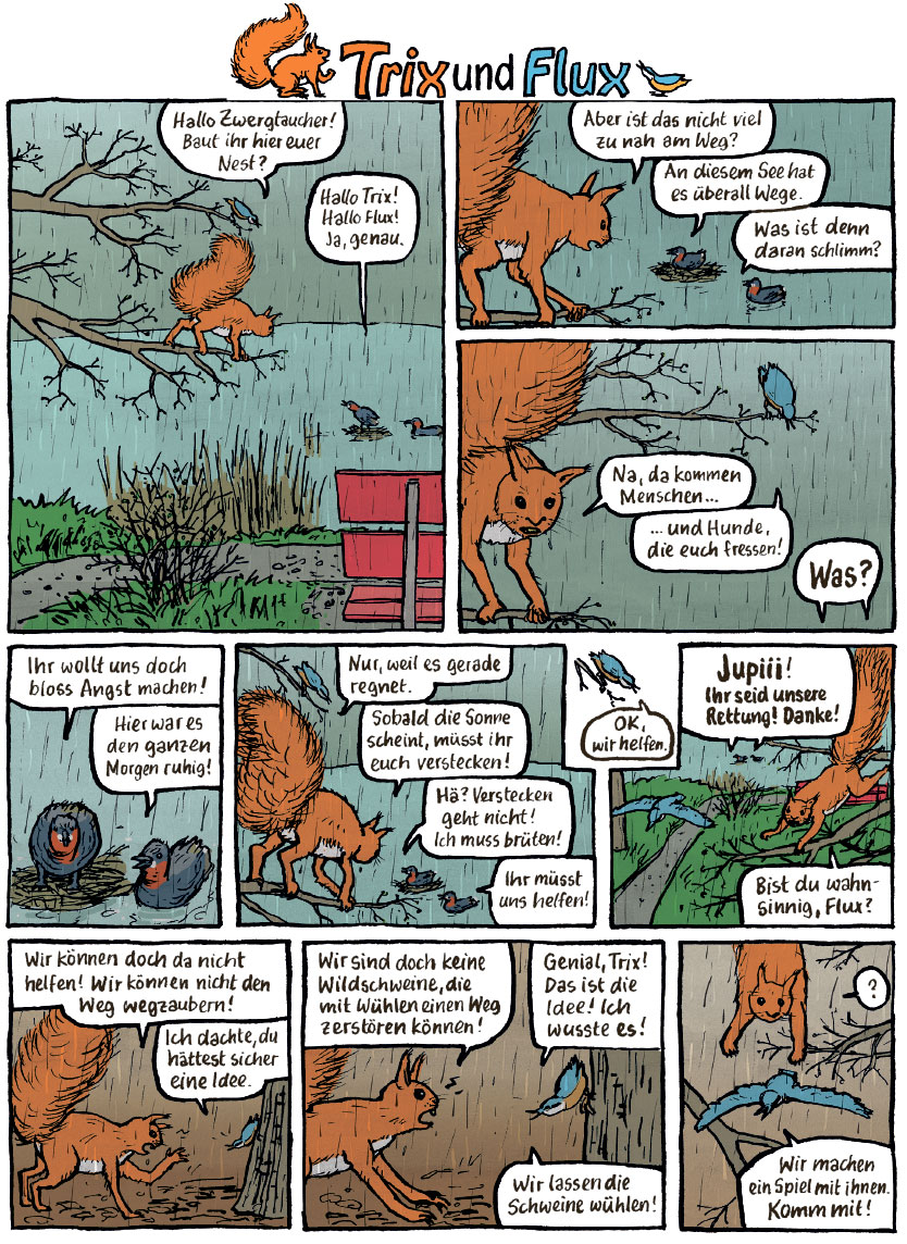 Trix ist ein Eichhörnchen, Flux ein Kleiber. Ihre Abenteuer erscheinen viermal jährlich im Ornis Junior, der Zeitschrift von BirdLife Schweiz. Kinder lieben die vier Seiten Comicgeschichten aus dem Wald.